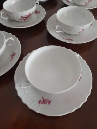Elegante set di sei tazze con piattini Ginori, perfetti per ogni occasione. Realizzati in pregiata porcellana, presentano un delicato motivo floreale. - Sei tazze con sei piattini abbinati. - Design classico con decorazioni floreali rosa. - Materiale: porcellana.