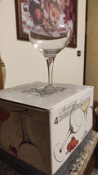 Coppe da spumante champagne 22.5 cl in vetro sonoro superiore. Linea Michelangelo. Marca Bormioli Rocco. Confezione da 4 coppe. Nuove, nella confezione originale.