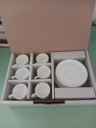 Bellissimo set da caffè in porcellana composto da 6 tazzine da caffè e 6 piattini. Le tazzine sono di colore bianco e presentano un design semplice ed elegante. Mai usato