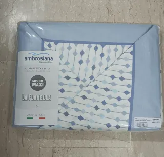 Completo letto matrimoniale in pura flanella di cotone, con un design moderno a losanghe azzurre e bianche. - Misure Maxi. - Made in Italy.