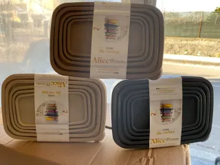 Set di 5 contenitori rettangolari trasparenti con coperchio, marca Alice. - Dimensioni: 15 x 7,5 x 4 cm - Dimensioni: 16,5 x 9 x 5 cm - Dimensioni: 18,5 x 11 x 6 cm - Dimensioni: 20,5 x 12,5 x 7 cm - Dimensioni: 22,5 x 15 x 8 cm - Articolo: 749065 - Colori assortiti