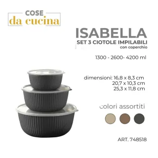 Set di 3 ciotole impilabili ISABELLA con coperchio. - Capacità: 1300 ml, 2600 ml, 4200 ml. - Dimensioni: 16,8 x 8,3 cm, 20,7 x 10,3 cm, 25,3 x 11,8 cm. - Colori assortiti disponibili.