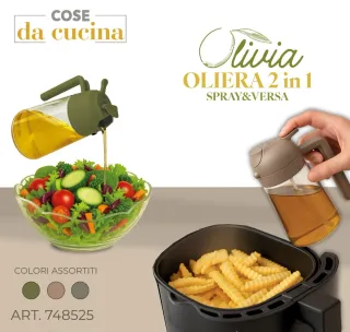 Pratica oliera Olivia 2 in 1, perfetta per condire le tue insalate o per spruzzare olio sulle tue pietanze. - Design elegante e funzionale. - Ideale per spray e versamento. - Materiali misti vetro e plastica.