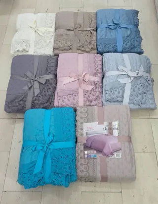 Elegante trapuntino matrimoniale rifinito con pizzo San Gallo. - Design raffinato con dettagli in pizzo. - Tessuto di qualità per un comfort ottimale.