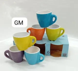 Set di sei tazzine colorate, perfette per un caffè. - Realizzate in ceramica e porcellana. - Ogni tazzina presenta un colore vivace: blu, verde, arancione, viola e giallo.