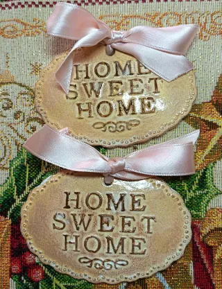 Deliziose targhe decorative in stile Shabby Chic, perfette per aggiungere un tocco di calore alla tua casa. La scritta Home Sweet Home è in rilievo, con un design che ricorda la ceramica. - Set composto da due targhe. - Nastrini in raso rosa per appenderle. - Bordi decorati con piccoli puntini. - Finitura anticata che conferisce un aspetto vintage.