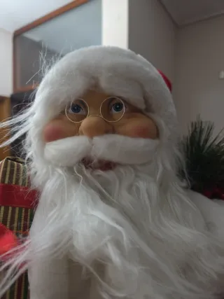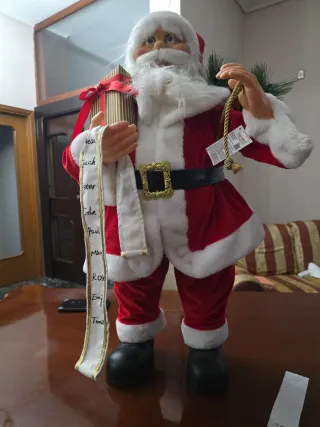 Decorazione di Babbo Natale con una lista di nomi e un pacco regalo. - Dettagli in tessuto e plastica. - Vestito rosso con bordi bianchi. - Cintura nera con fibbia dorata. - Barba e capelli bianchi.