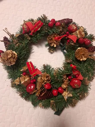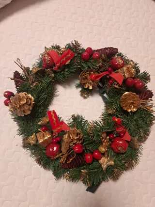 Bellissima ghirlanda natalizia, perfetta per decorare la tua casa durante le feste. - Realizzata a mano con cura. - Decorata con pigne dorate e bacche rosse. - Nastrini rossi con dettagli dorati.
