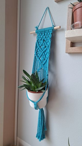 Portavaso pensile in macramè, realizzato a mano e colore blu. Lunghezza 60 cm circa e realizzabile anche in altri colori.