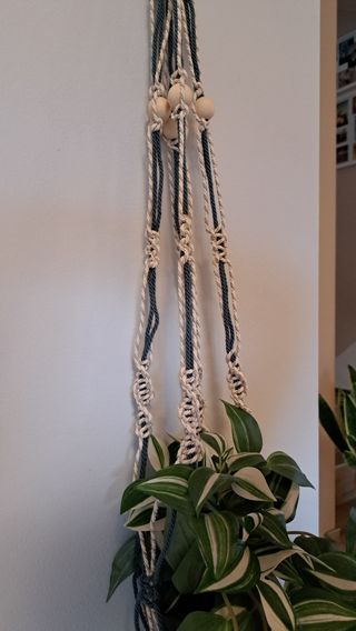 Portavaso pensile in macramè, realizzato a mano, color blu e beige, lunghezza 110 cm circa. Realizzabile anche in altri colori