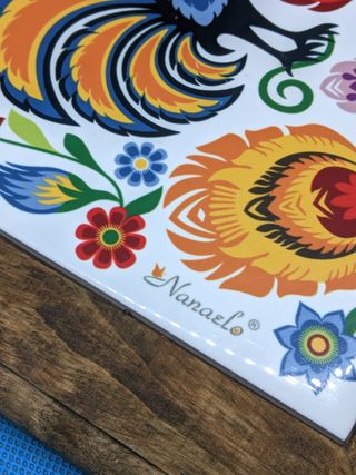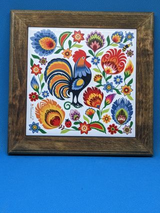 Mattonella Sottopentola 20x20 cm legno e ceramica Nanaelo Polonia Usata ottime condizioni - vedi foto Gallo e Fiori, Ceramica e cornice di legno , sottopentola decorato si può anche appendere in una cucina #rustica Maiolica della Polonia in buono stato, caratteristica! Decorato con motivi floreali di Łowicz. #polski #polonia #polish #nanaelo #chicken #gallo #coq