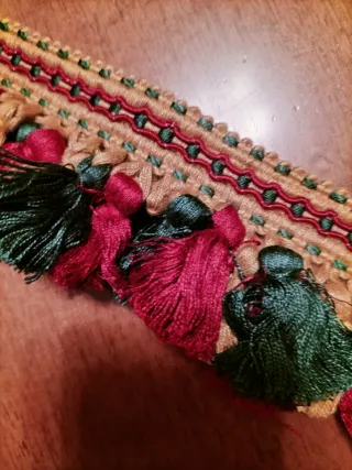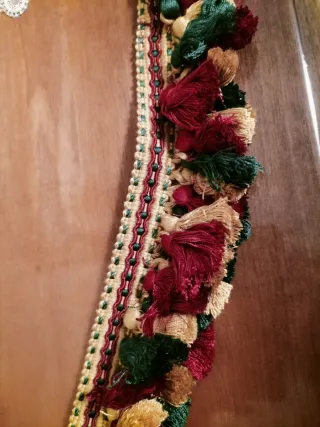 Bellissima frangia decorativa con nappe colorate. - Nappe nei colori bordeaux, verde e oro. Prezzo si riferisce al metro lineare
