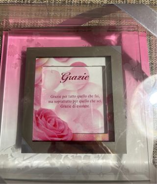 Delicato soprammobile con dedica, in confezione originale mis.13x13cm. - Messaggio Grazie per tutto quello che fai, ma soprattutto per quello che sei. Grazie di esistere. - Decorazione floreale con petali rosa e una rosa. - Cornice in vetro.
