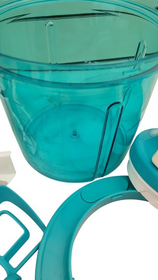 Tupperware Extra Chef turchese Capacità: 1,35 L, diametro: 15,6 cm, altezza: 19,5 cm Coperchio con cordino + 3 lame + frusta + imbuto. Lavabile in lavastoviglie (tranne il coltello). Con fondo antiscivolo. Prezzo di listino €84,90