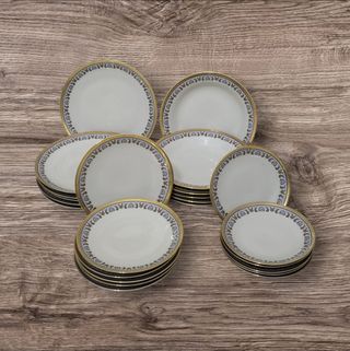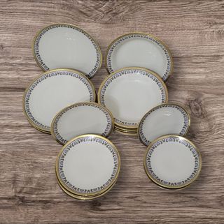 Servizio 24 piatti Bavaria in oro Zecchino e Cobalto in perfette condizioni, praticamente nuovo, regalo di matrimonio dei miei nonni mai utilizzato. Il Servizio è da 6 o 12 Comprende 6 o 12 piatti fondi, 6 o 12 piatti piani, 6 o 12 piatti da frutta e 6 o 12 piatti da dessert. Possibilità di doppio piatto piano (12 o 24) Il prezzo è per il servizio da 6 €480 per il servizio da 12