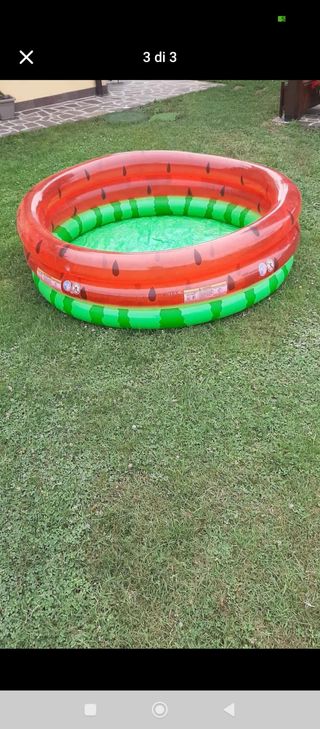 Divertente piscina gonfiabile a forma di anguria, perfetta per i più piccoli. Misure 168x38 cm - Design a spicchi d'anguria con semi neri. - Anelli gonfiabili separati per maggiore stabilità. - Ideale per il giardino o la terrazza.