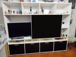 Parete attrezzata lunga 2.40m, alta 1.95m e profonda 53cm in ottimo stato. Vendo per passaggio a nuova in seguito a ristrutturazione. Bianca e nera, come in foto. Composizione: 4 vani superiori 58cmx36.5cm cad. 1 vano aperto 117cmx89.5cm 1 vano coperto con cassetti e vani interni 4 vani inferiori 58cmx13.5cm cad. 4 vani con sportelli 58cmx44cm cad. Il portellone nero lucido scorre completamente tramite due binari. Disponibile da subito. TV e suppellettili non inclusi. Se interessati contattare per organizzare il ritiro in quanto non posso spedire né portare. Possibilità di smontarla a blocchi per agevolare il ritiro.