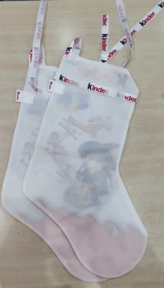Quantità 2 calze della befana maxi, Kinder dotate di laccetti di chiusura con la scritta Kinder, ganci per appenderle, raffigurante befana e prodotti Kinder.
