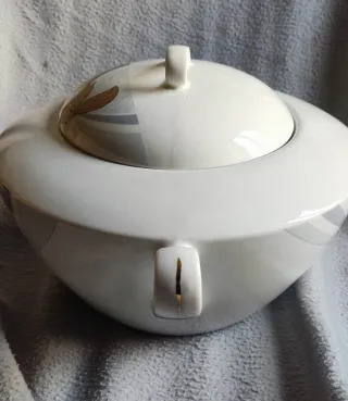 Graziosa zuppiera, marca tognana, italiana degli anni 90, perfetta in tutte le sue parti, nessun danno, decoro con foglia dorata, diametro esterno 24 cm, ingombro totale con i manici 32 cm, altezza compresa manico del coperchio 17 cm.