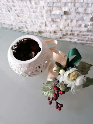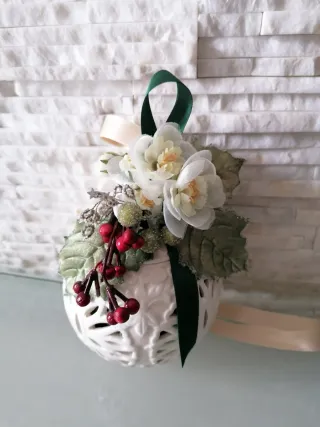 Elegante porta pot-pourri in ceramica bianca, perfetto per essere appeso. - Design traforato con decorazioni floreali. - Include elementi decorativi come bacche rosse e fiori. - Dotato di nastro per appenderlo.