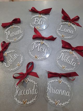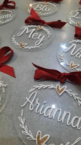palline personalizzate per l'albero di Natale, perfette per dare un tocco unico alle tue festività. - Ogni pallina è decorata con un nome o frase - opzionali ghirlanda di foglie e cuoricini dorati. - Sono dotate di un nastro di raso rosso per appenderle ma se può scegliere il colore del fioco come volete - Ideali come segnaposto, bomboniere o da regalare pallina pexiglass 10cm