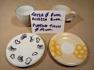 Set composto da due tazze e due piattini. - Tazze Nuove Piattini usati. - Tazze Granarolo con diametro 8 cm e altezza 10 cm. - Piattini Thun con diametro 18 cm. - Include un filtro per tisane o tè Nuovo.