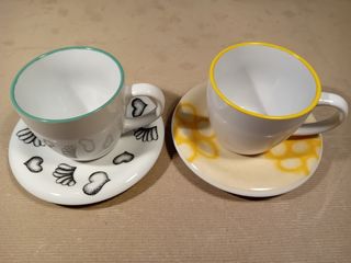Set di due tazze e due piattini, Nuovi. - Tazze con bordo colorato (verde e giallo) anonime. - Piattini decorati con disegni (cuori, ali e motivi floreali). Thun. - Diametro tazze: 8 cm. - Altezza tazze: 8 cm. - Diametro piattini: 15 cm.