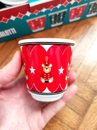 Set di 4 tazzine bicchierini da caffè Bialetti. Confezione edizione limitata natalizia Joyful Memories con fantasia orsetto. 2 coppie di colore rosso e blu/verde petrolio. Nuove, ancora nella scatola originale, mai utilizzate e perfettamente conservate. Aperto solo per fare le foto.