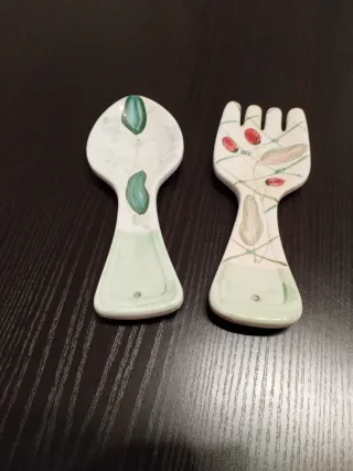 Set di due utensili da cucina in ceramica, uno a forma di cucchiaio e uno a forma di forchetta. Presentano un design decorato con elementi naturali. Misure: lunghezza 22 cm. Larghezza 10 cm - Pezzi: 2 - Materiale: Ceramica - Colore: Bianco e verde