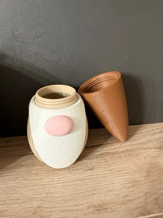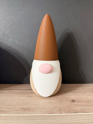 Originale gnomo contenitore, perfetto per aggiungere un tocco di stile alla tua casa. La sua forma conica e il design pulito lo rendono un pezzo unico. - Cappello a cono marrone. - Corpo bianco testurizzato. - Naso rotondo rosa.