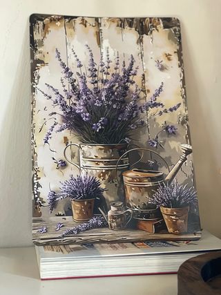 Targa decorativa con un motivo floreale di lavanda. - Stile rustico e shabby chic. - Ideale per decorare pareti o porte. - Dimensioni: 30x20 cm. Imperfezioni sulla superficie dovute ad imballo non adeguato