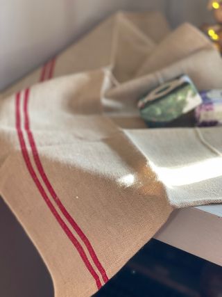 Asciugamano da cucina di origine francese con un design a righe rosse su fondo beige. - Misure: 60x87 cm. - Materiale: Lino.