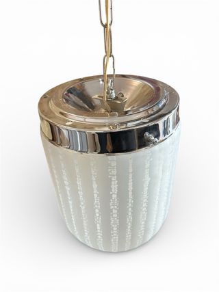 Elegante lampadario in vetro e metallo, in vetro di Murano - Dettagli in metallo lucido. - Vetro lavorato con motivi verticali. - Catena per sospensione inclusa.