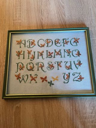 Bellissimo quadro decorativo con alfabeto a punto croce. Un pezzo unico fatto a mano, perfetto per aggiungere un tocco di originalità. - Dimensioni: 26x32 cm. - Design con lettere decorate da elementi naturali.