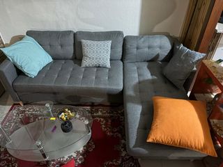 Divano angolare in tessuto grigio scuro, molto comodo e in ottime condizioni. - Cuscini decorativi inclusi: uno azzurro, uno grigio con motivo geometrico e uno arancione. - Struttura robusta e design moderno.