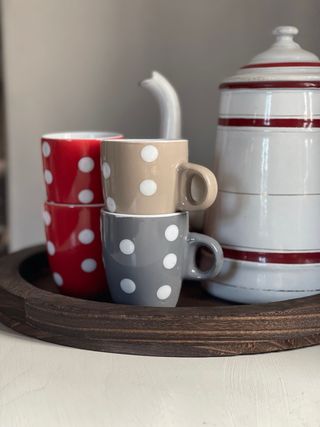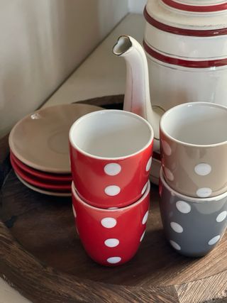 Set di 4 tazzine con piattino da caffè con un grazioso motivo a pois. - Design a pois. - Colori assortiti: beige, grigio e rosso.