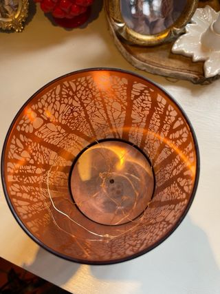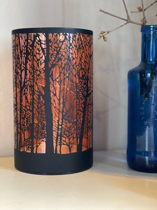 Elegante lampada da tavolo con un design ispirato a un bosco invernale. - Finitura esterna in metallo nero traforato. - Dettagli interni color rame. - Base in metallo nero. Alimentazione a pile 20 cm altezza diametro 12