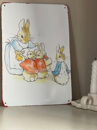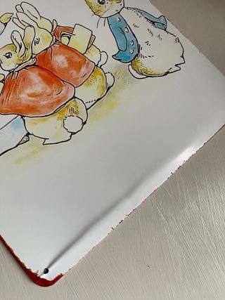 Decorazione in metallo con un'illustrazione dei personaggi di Beatrix Potter. - Design colorato e vivace. - Bordi leggermente anticati per un tocco vintage. Leggera piegatura su un bordo (evidenziata) Misura 30x20