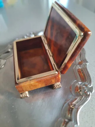 Elegante scatola vintage, un pezzo realizzato in Italia, - Finitura in stile tartarugato. - Dettagli dorati. - Base con piedini decorativi in acciaio.