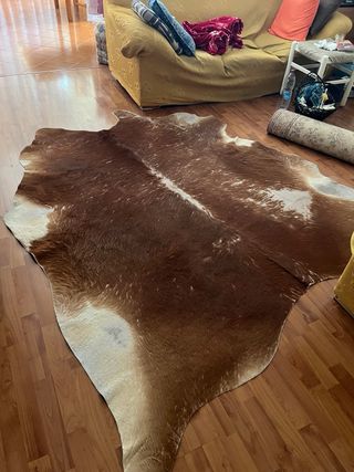Bellissimo tappeto in pelle di mucca, perfetto per aggiungere un tocco rustico e unico alla tua casa. - Motivo maculato marrone e bianco. - Materiale naturale e resistente. Tappeto in pelle di mucca 4 mq Coldby Ikea buone condizioni Presenta qualche segno di usura Misure massime 2 mt x 2 mt circa 4 metri quadri Tenuto molto bene come da foto