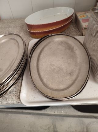 Vendo vassoi da portata in acciaio. Disponibili: 10 ovaline 39x26cm 15 ovaline 35x23cm 6 ovaline 33x21cm 16 ovaline 25x16,5cm Ideali per le portate di antipasti, anche da mettere in forno. Possibilità di vederli di persona, disponibili anche piatti, bicchieri e brocche. Contattate pure per altre info o per un'eventuale spedizione! Il prezzo varia in base alla grandezza.