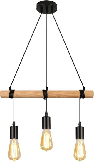 Lampadario dal design industriale, perfetto per dare un tocco di stile unico ai tuoi ambienti. - Struttura in legno e dettagli in metallo. - Finitura bicolore nero e marrone.