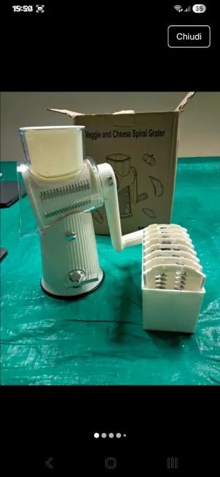 Grattugia a spirale manuale per verdure e formaggio. Strumento da cucina versatile che grattugia, sminuzza e affetta vari ingredienti, come patate, carote zucchine e formaggi, include lame intercambiabili per diversi tipi di taglio affettare, sminuzzare, grattugiare e una manovella per l'uso. Articolo totalmente NUOVO mai usato ancora nella confezione originale...