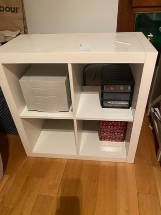 Scaffale modulare con quattro cubi, ideale per organizzare il tuo spazio modello Kallax. Design moderno e funzionale. Finitura in bianco. Realizzato in legno. Alla base c'è umidità in alcuni punti ma non influisce sulla sua funzione.