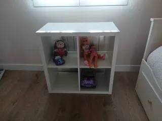 Scaffale bianco in legno, ideale per camerette. Il suo design semplice e pulito si adatta a qualsiasi arredamento. - Struttura in legno. - Finitura bianca. - Design di Ikea. Include accessori per il cambio del bambino in perfetto stato.