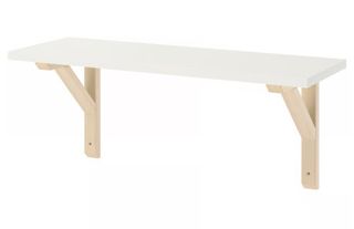 Scaffale a parete modello BURHULT di Ikea, con dimensioni di 59x20 cm. Il suo design semplice e moderno si adatta a qualsiasi spazio. Colore bianco con dettagli in legno chiaro. Piccolo difetto in un angolo, che non si nota se lo scaffale è posizionato correttamente.