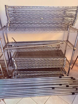 Vendo 8 scaffalature complete a ripiani in robusto metallo cromato. Queste scaffalature sono estremamente versatili e ideali per ottimizzare l'organizzazione in magazzino, garage, cantina, negozio o come ampia dispensa. Ogni singola scaffalatura misura 180 cm di altezza, 90 cm di lunghezza e 45 cm di profondità. Il sistema di montaggio è rapido, tipico delle strutture modulari. Il prezzo indicato si riferisce alla singola scaffalatura completa di ripiani in griglia e montanti. Le scaffalature sono praticamente nuove, acquistate nuove a 160 euro l'una. Sono già smontate, disponibile la spedizione o ritiro di persona.