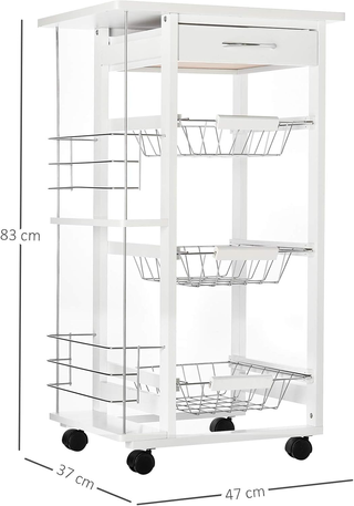 SALVASPAZIO: Compatto e salvaspazio, questo carrello da cucina con ruote è perfetto se hai una cucina di piccole dimensioni MULTIUSO: Con questo carrellino da cucina, hai a disposizione un piano di lavoro per impastare o cucinare, un cassetto, tre cesti estraibili in metallo e due portabottiglie laterali IN LEGNO DI PINO: La struttura del carrello da lavoro è costruita con legno di pino con finitura bianca, robusto e durevole CON 4 RUOTE: Facile da spostare grazie alle 4 ruote con rotazione a 360° e diametro di 4 cm PER LA TUA CUCINA: Usalo per creare spazio extra nella tua cucina o per servire pietanze e manicaretti ai tuoi ospiti