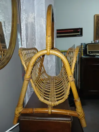 Elegante portariviste realizzato in rattan, perfetto per organizzare riviste e giornali. - Struttura intrecciata a mano. - Manico curvo per un facile trasporto. - Base stabile in legno.