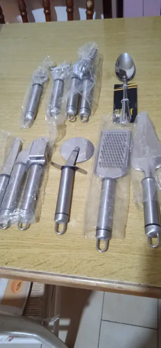 Set di utensili da cucina in metallo con manici in plastica. - Utensili inclusi: pelapatate, spremiaglio, tagliapizza, grattugia, paletta per torte, cucchiaione. - Design moderno e funzionale.